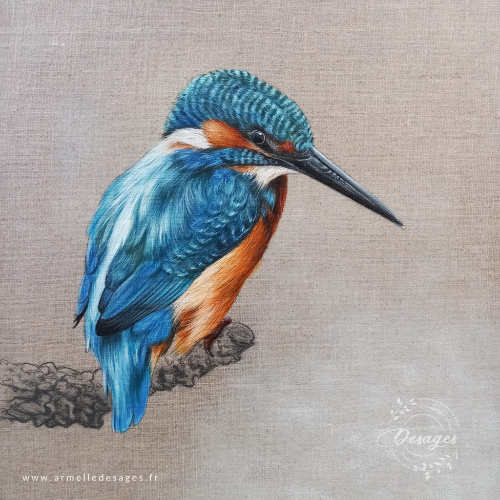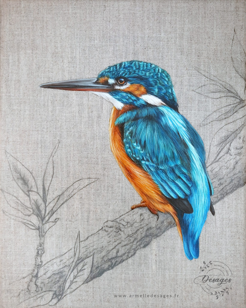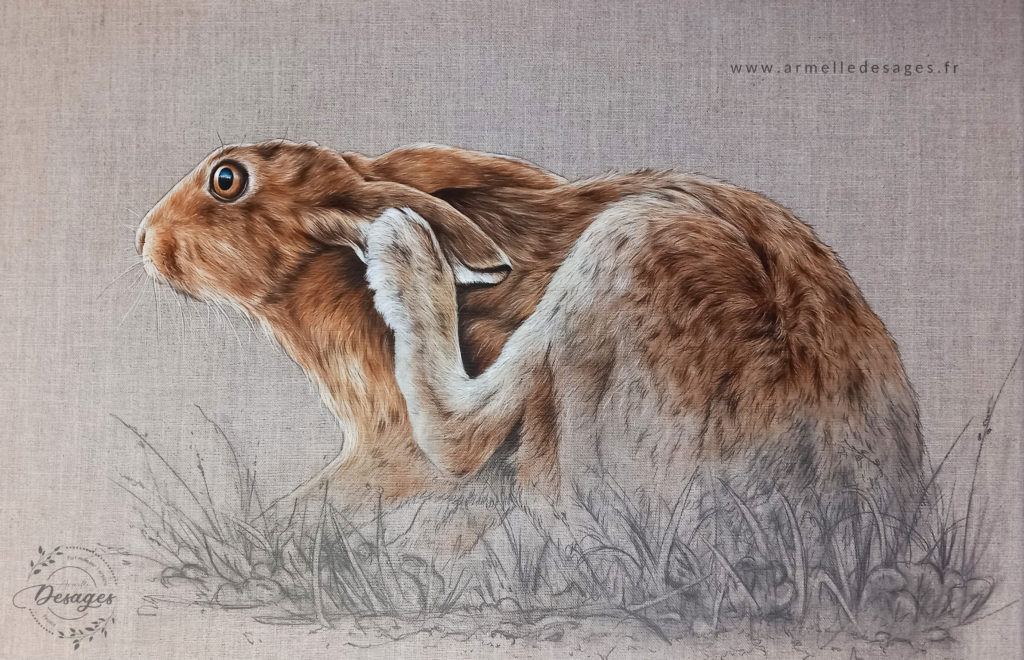 Je travaille toujours d’après photo. Chaque tableau commence par un premier croquis, esquissé au crayon sur le support. La mise en couleurs ne commence qu’après une longue observation des teintes, des lumières, des ombres, des volumes. Il faut avoir compris la morphologie de l’animal pour réaliser un portrait de qualité. Tous les portraits sont réalisés exclusivement à la main. Chaque portrait est un travail de patience et de minutie…