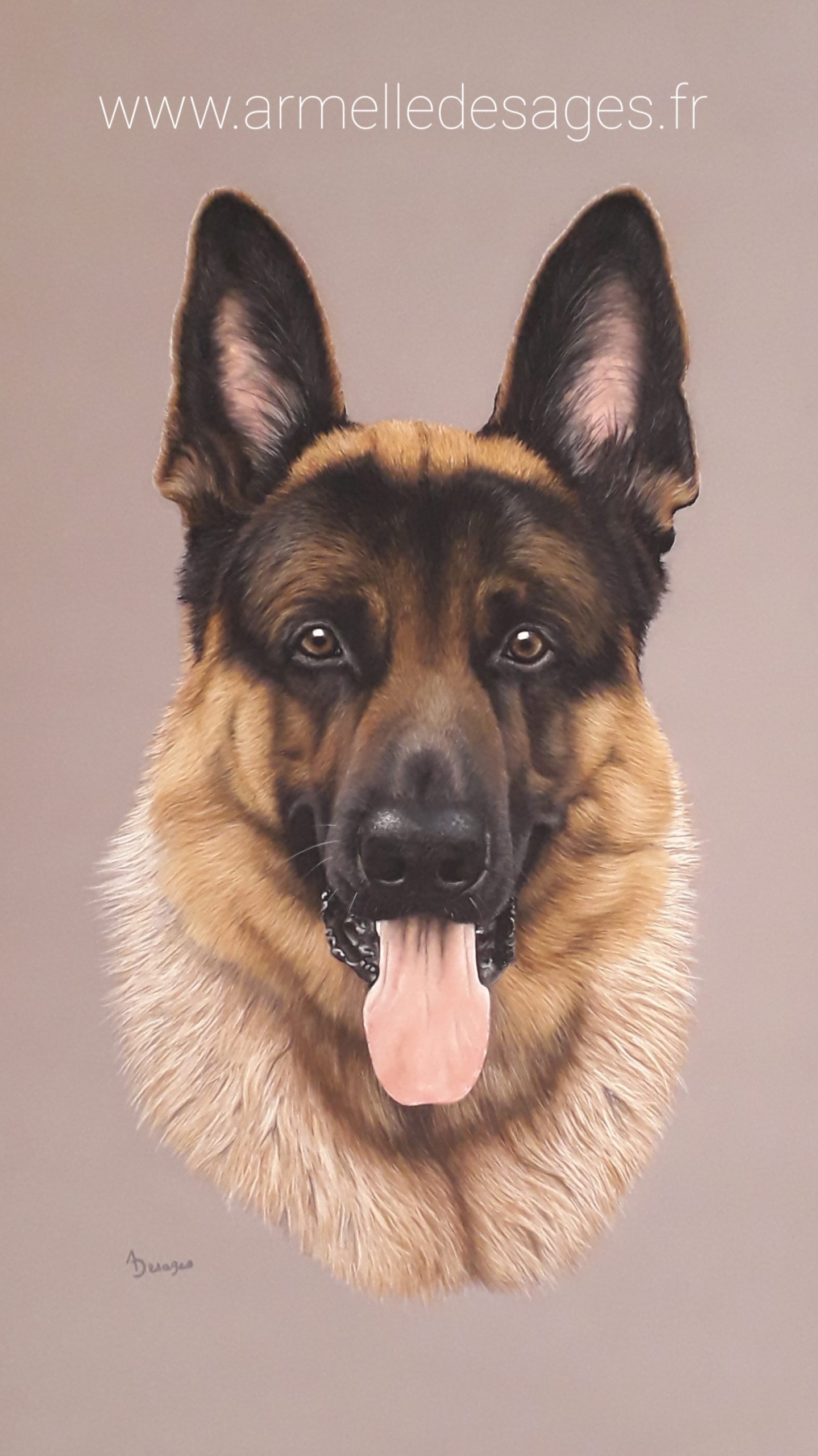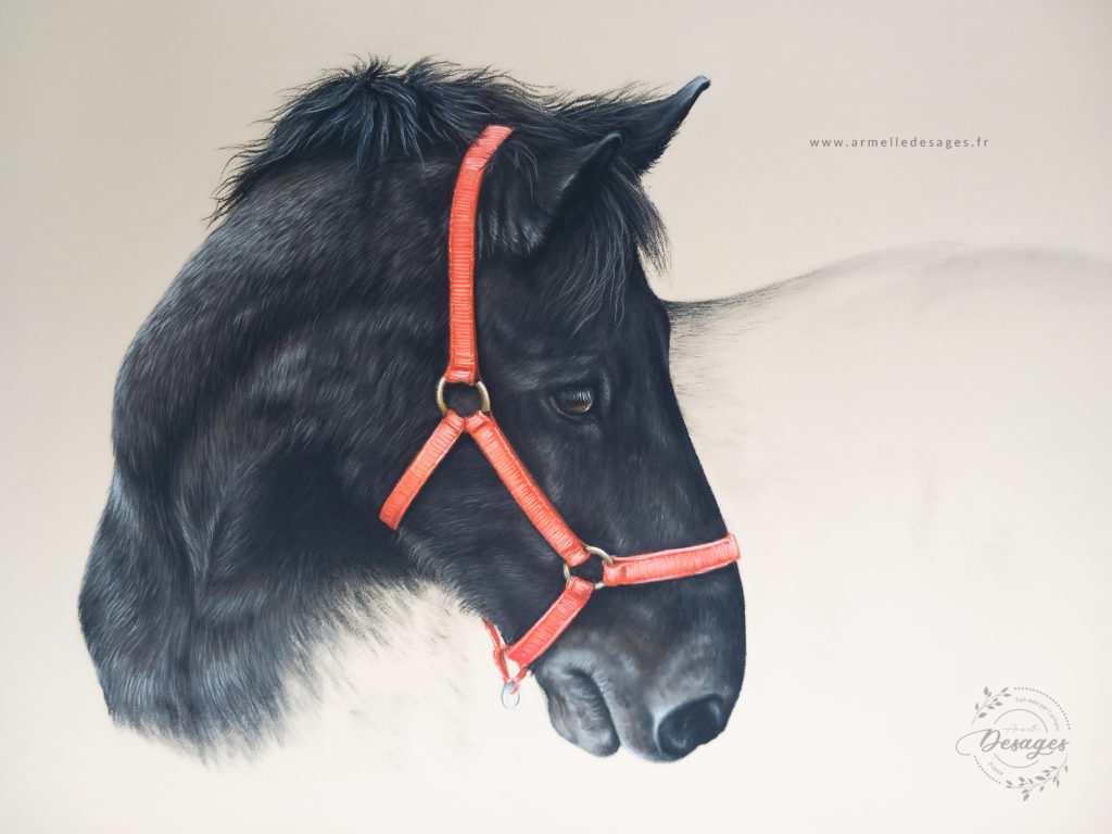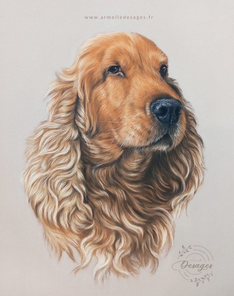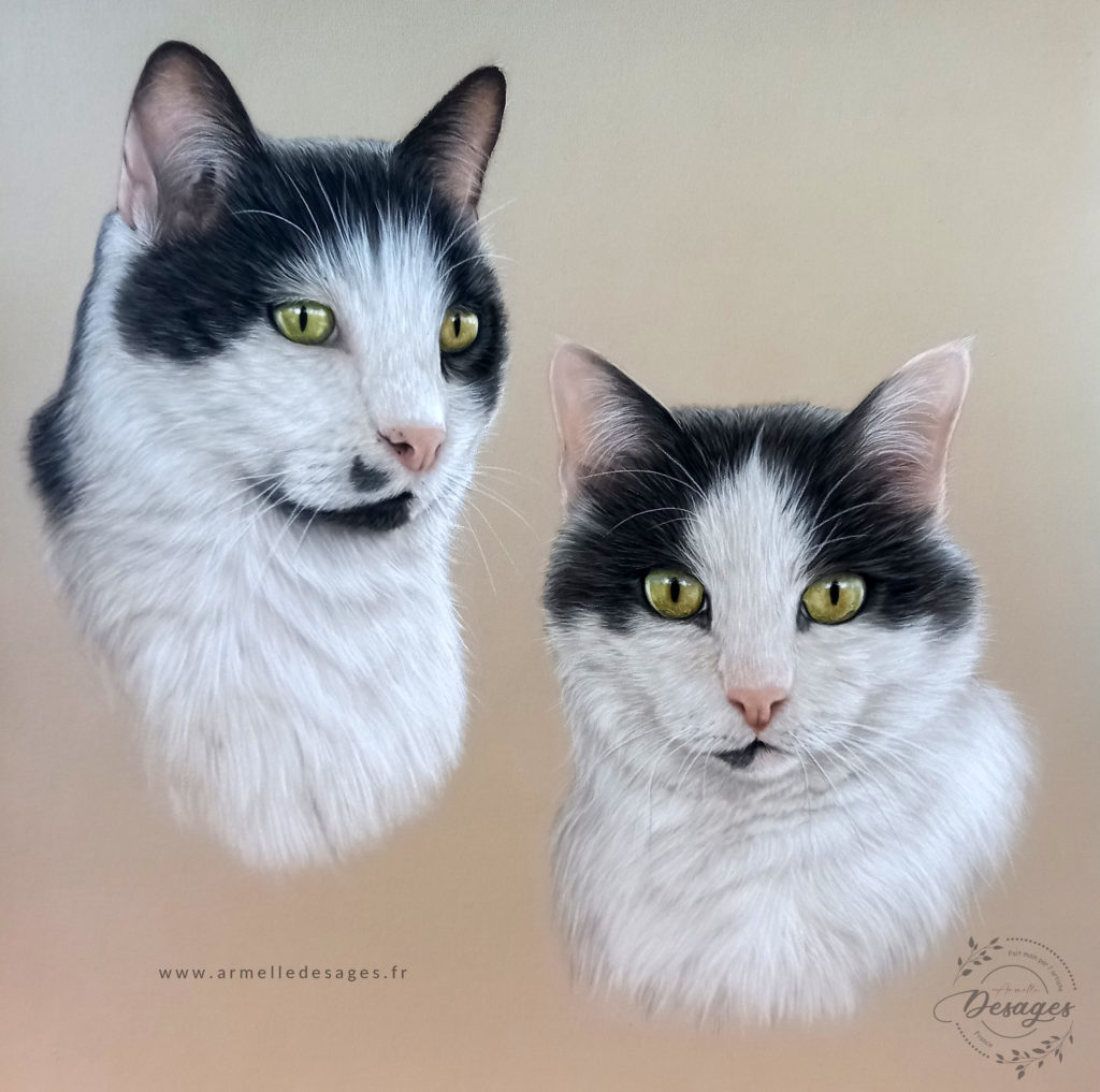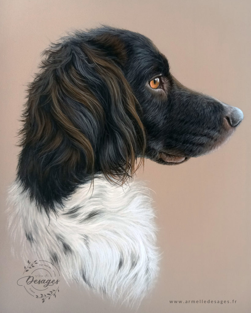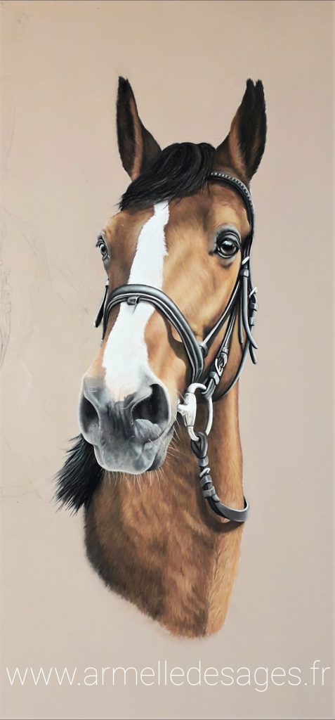 Je travaille toujours d’après photo. Chaque tableau commence par un premier croquis, esquissé au crayon sur le support. La mise en couleurs ne commence qu’après une longue observation des teintes, des lumières, des ombres, des volumes. Il faut avoir compris la morphologie de l’animal pour réaliser un portrait de qualité. Tous les portraits sont réalisés exclusivement à la main. Chaque portrait est un travail de patience et de minutie…