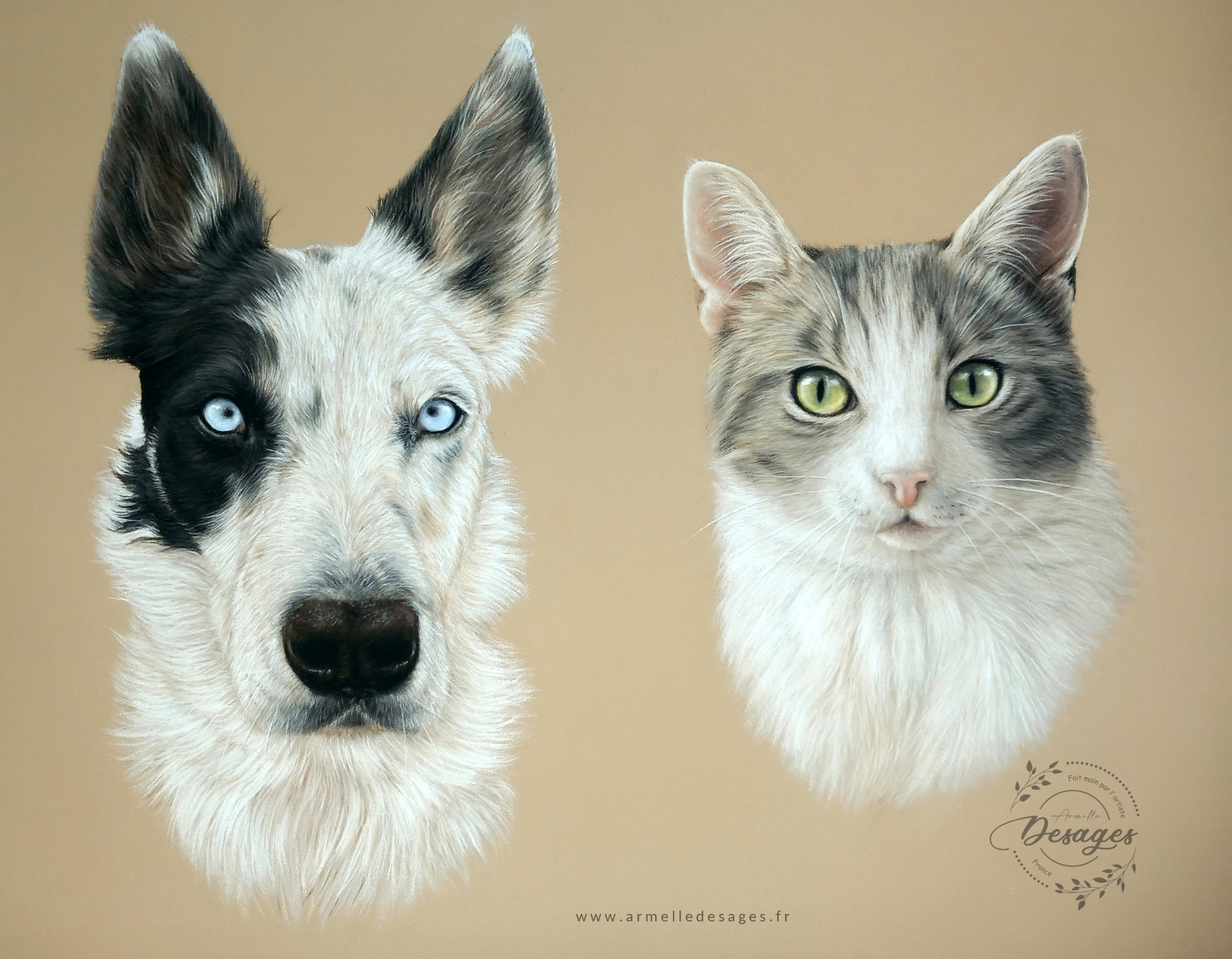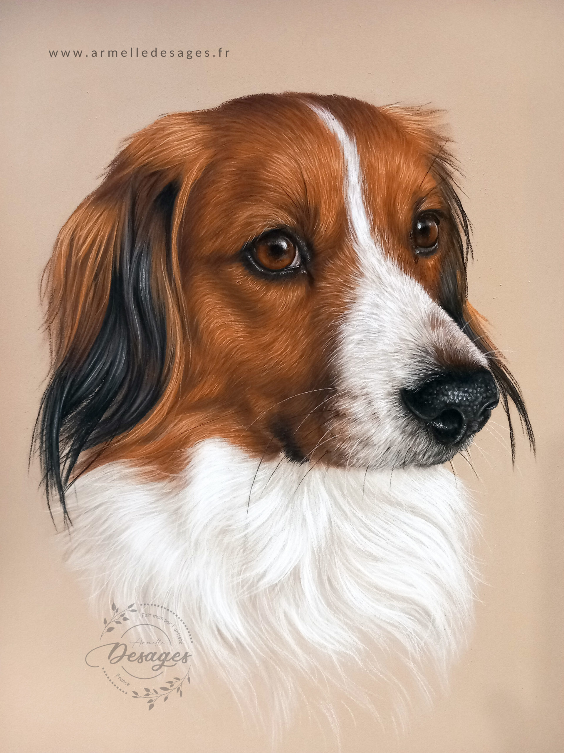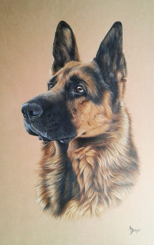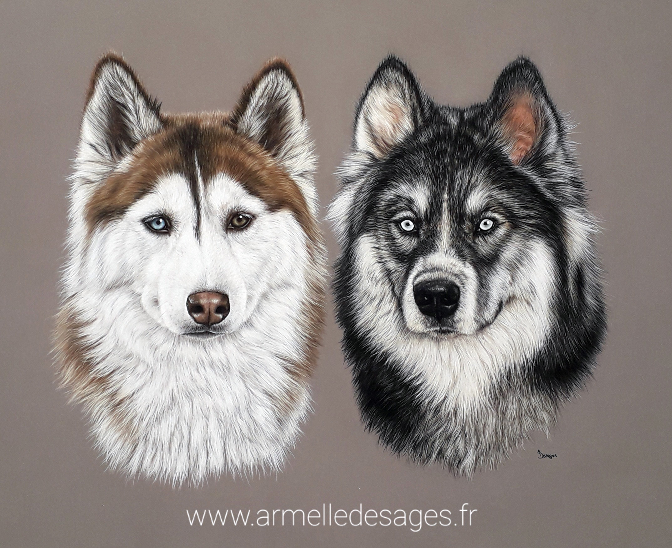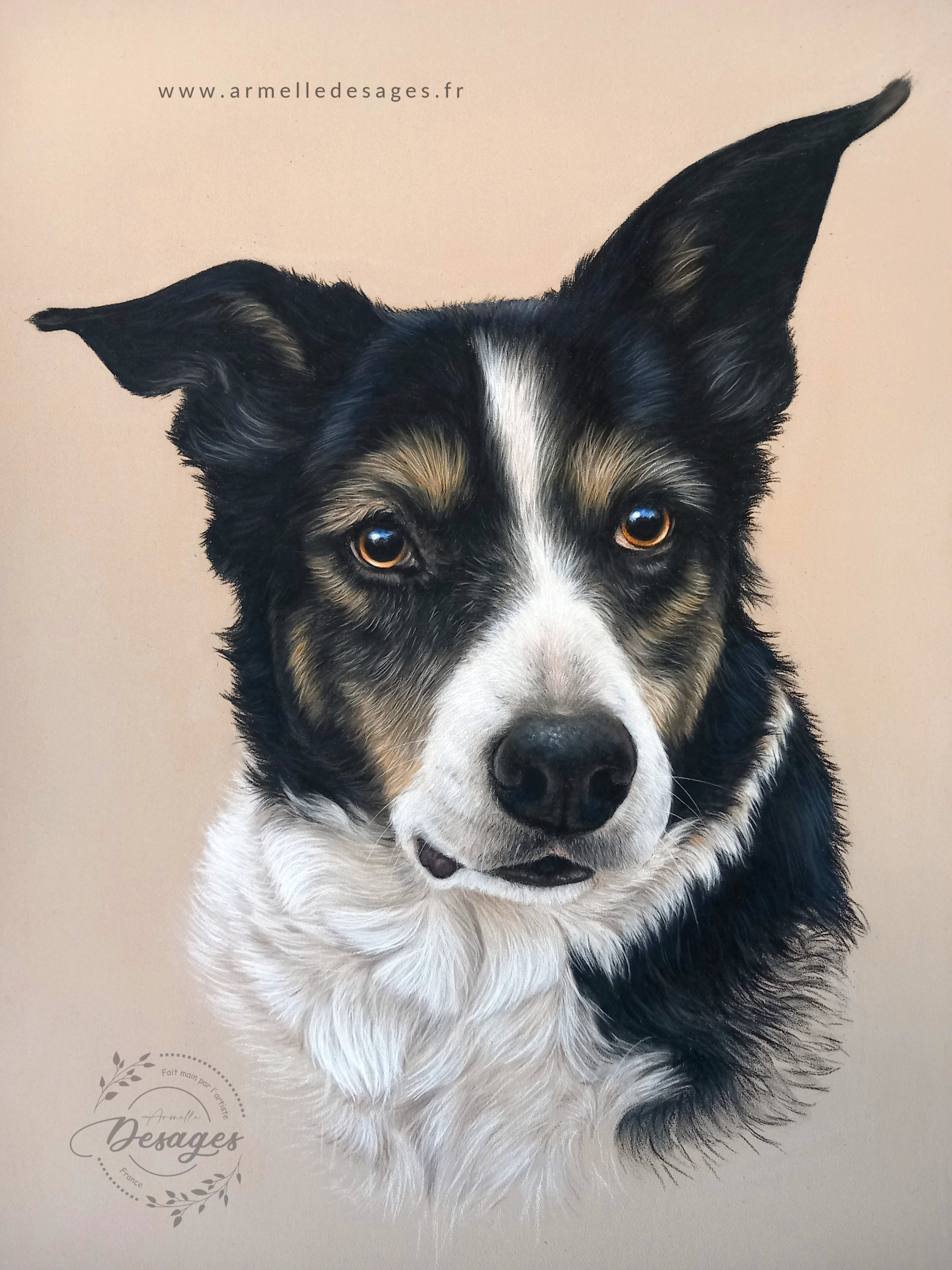 Je travaille toujours d’après photo. Chaque tableau commence par un premier croquis, esquissé au crayon sur le support. La mise en couleurs ne commence qu’après une longue observation des teintes, des lumières, des ombres, des volumes. Il faut avoir compris la morphologie de l’animal pour réaliser un portrait de qualité. Tous les portraits sont réalisés exclusivement à la main. Chaque portrait est un travail de patience et de minutie…