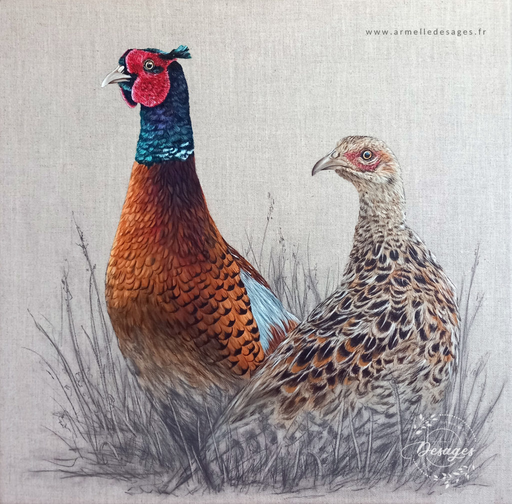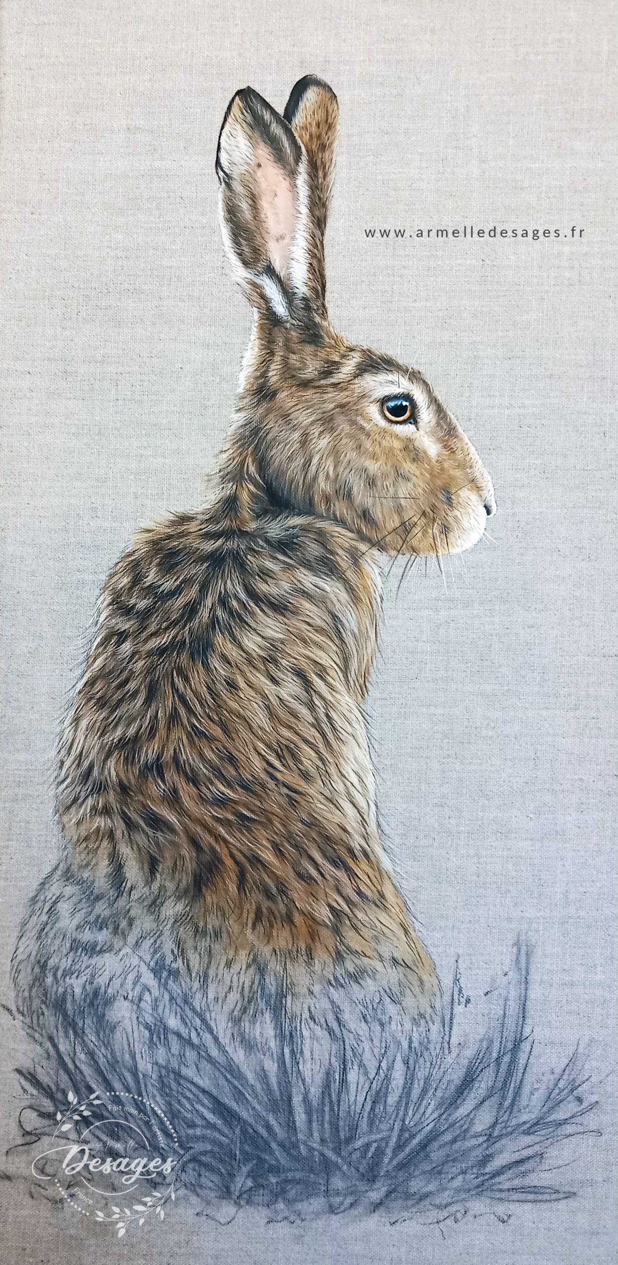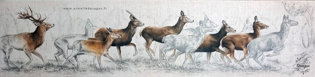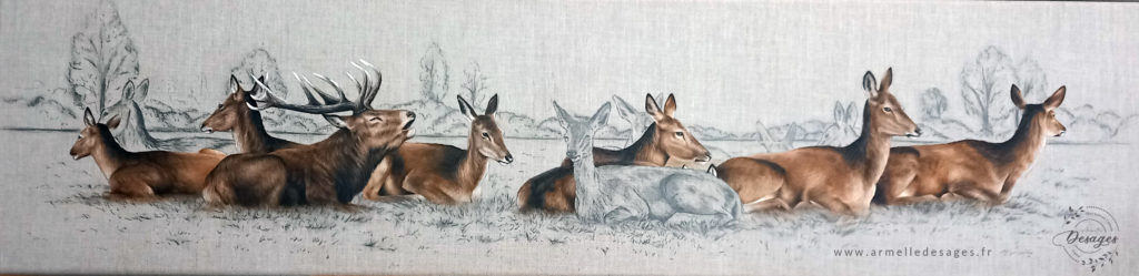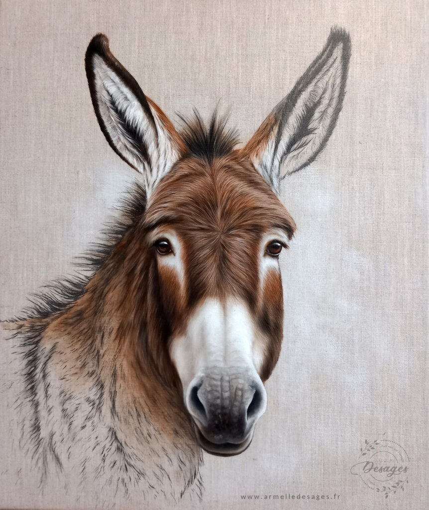 Je travaille toujours d’après photo. Chaque tableau commence par un premier croquis, esquissé au crayon sur le support. La mise en couleurs ne commence qu’après une longue observation des teintes, des lumières, des ombres, des volumes. Il faut avoir compris la morphologie de l’animal pour réaliser un portrait de qualité. Tous les portraits sont réalisés exclusivement à la main. Chaque portrait est un travail de patience et de minutie…